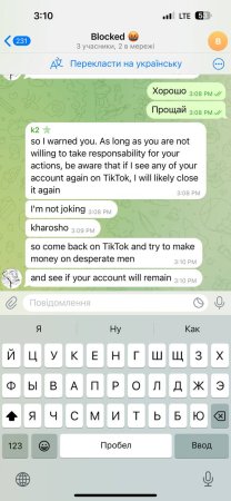 - Угрозы и шантаж в личных сообщениях: Агрессор начал с прямых угроз заблокировать основной аккаунт Марины в TikTok, осознавая его важность для неё.