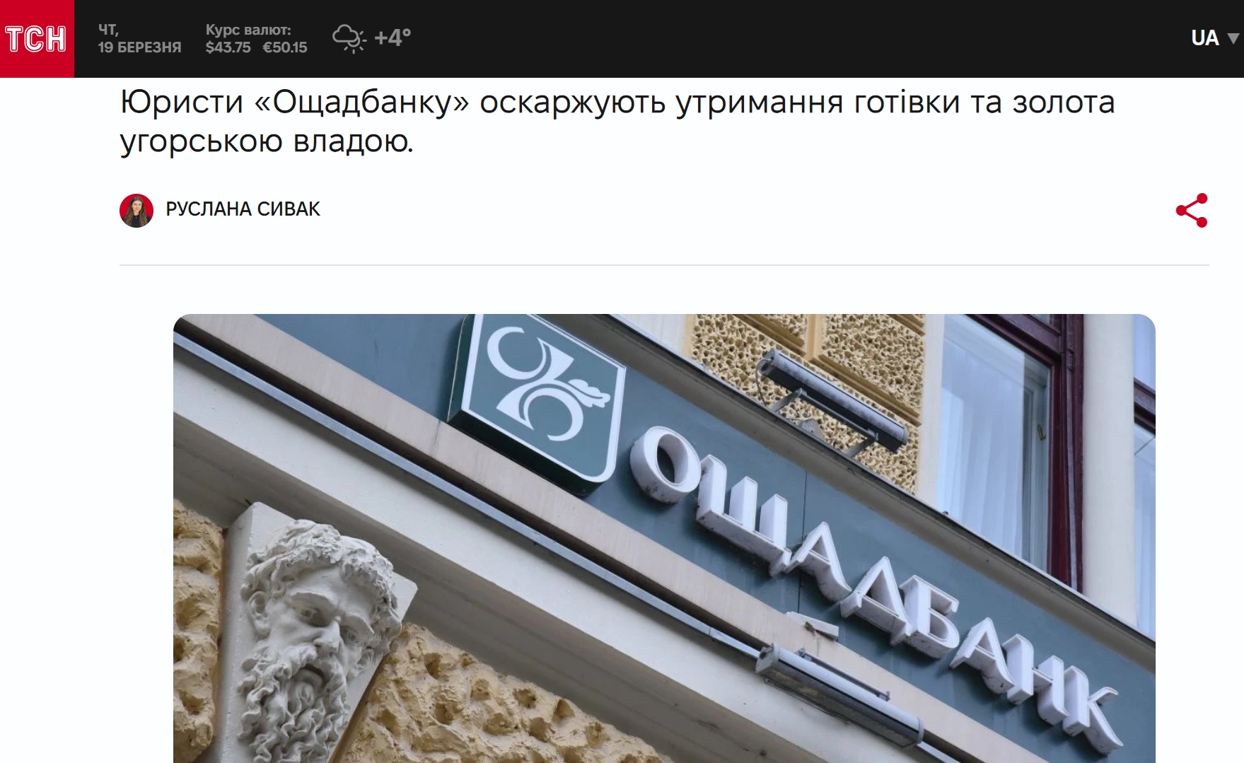 Україна виводить конфлікт з рейдерським захопленням коштів угорською стороною на міжнародний рівень: державний «Ощадбанк» подав позов до угорських органів (Центральної слідчої прокуратури Угорщини) через вилучення понад 82 млн доларів готівки та золота. Банк наполягає, що дії угорської сторони мають ознаки зловживання владою і використовують фінансові активи як інструмент політичного тиску - і тепер ця історія переходить у площину міжнародного правового протистояння, - пишуть ТСН.